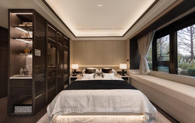 其中主卧的270°转角飘窗就有约5.7m²,通过与外立面的结合,直接做了梳妆台和储物柜,拓展了飘窗的实用性。