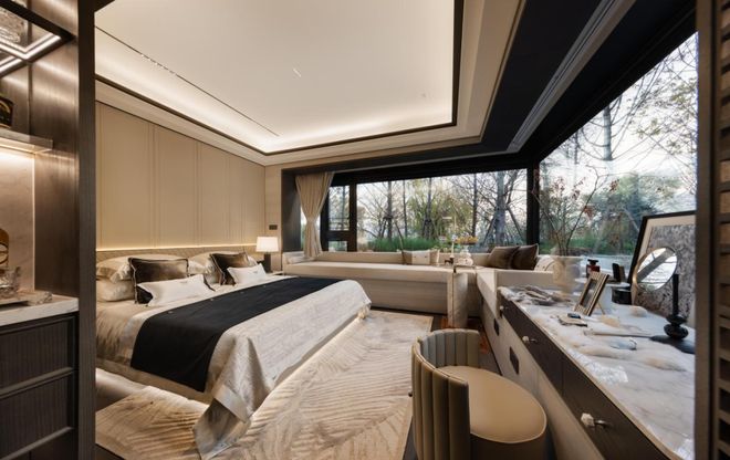 其中主卧的270°转角飘窗就有约5.7m²,通过与外立面的结合,直接做了梳妆台和储物柜,拓展了飘窗的实用性。